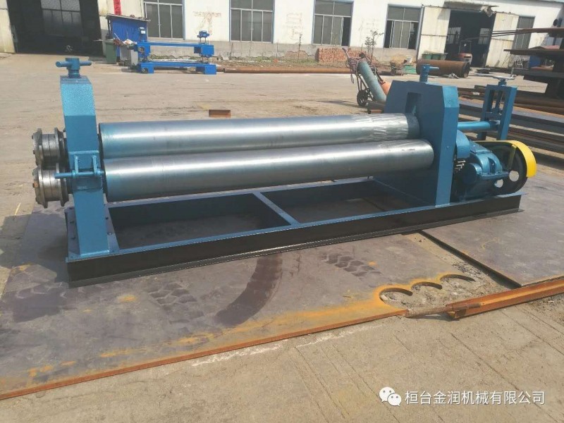 半自动卷板机,该机结构式为三辊对称式,上辊在两下辊中间对称位置作垂直升降运动,通过人工拧动丝杆使上辊垂直升降,两下辊作旋转运动,通过减速机的输出齿轮与下辊齿轮啮合,为卷制板材提供扭矩。上辊可分离取料手动升降起辊。