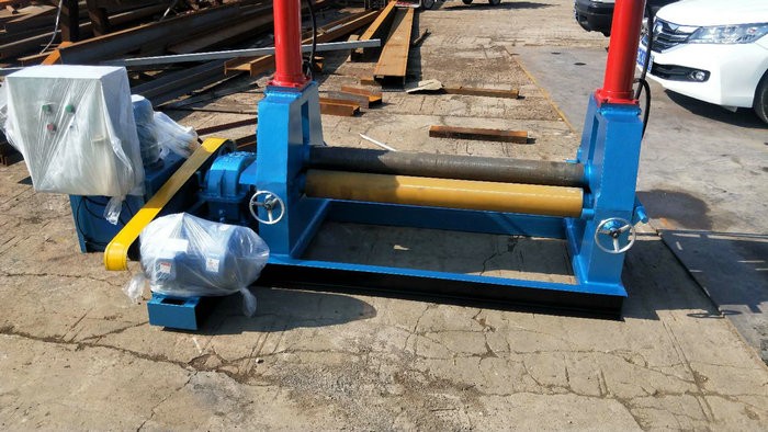 该机结构形式为三辊对称式。上辊在两下辊中间对称位置作垂直升降运动,通过蜗轮、蜗杆而获得,两下辊作旋转运动,通过减速机的输出齿轮与下辊齿轮啮合,实现板材的行走。当上辊的下压力超过材料的屈服限度时,便使所卷制的材料变形,变形过程如下图: