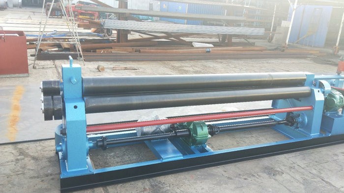 液压下拉式卷板机主要特点:该机上辊可以垂直升降,垂直升降的液压传动,通过液压缸内的液压油作用活塞杆而获得;下辊作旋转驱动,通过减速机输出齿轮啮合,为卷板提供扭矩,下辊下部有托辊,并可调节。上辊呈鼓形状,提高制品的直线度,适用于超长规格各种截面形状罐。 其主要产品为系列钢卷开平生产线、横剪线、挍平机、矫平机、剪板机、卷板机、法兰机、液压压力机等。